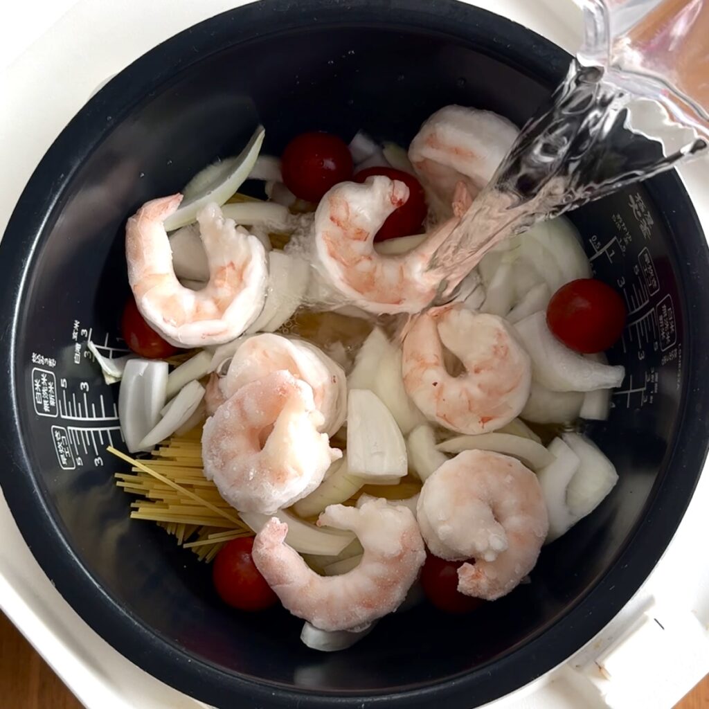 パスタは半分にカットし、クロスさせて炊飯器にいれる