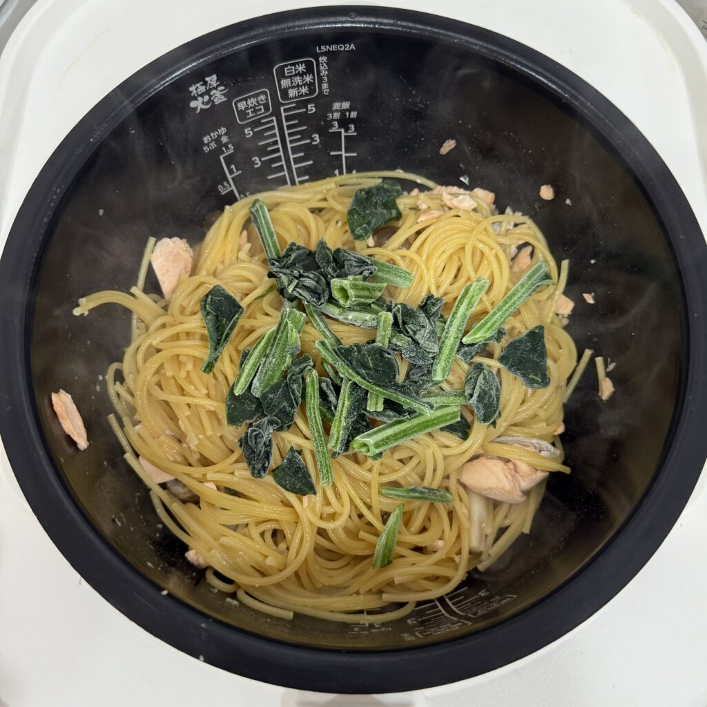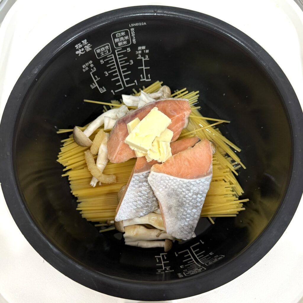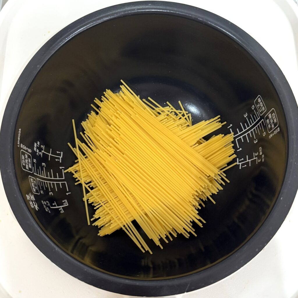 パスタは半分に折って、炊飯器にクロスするように入れる